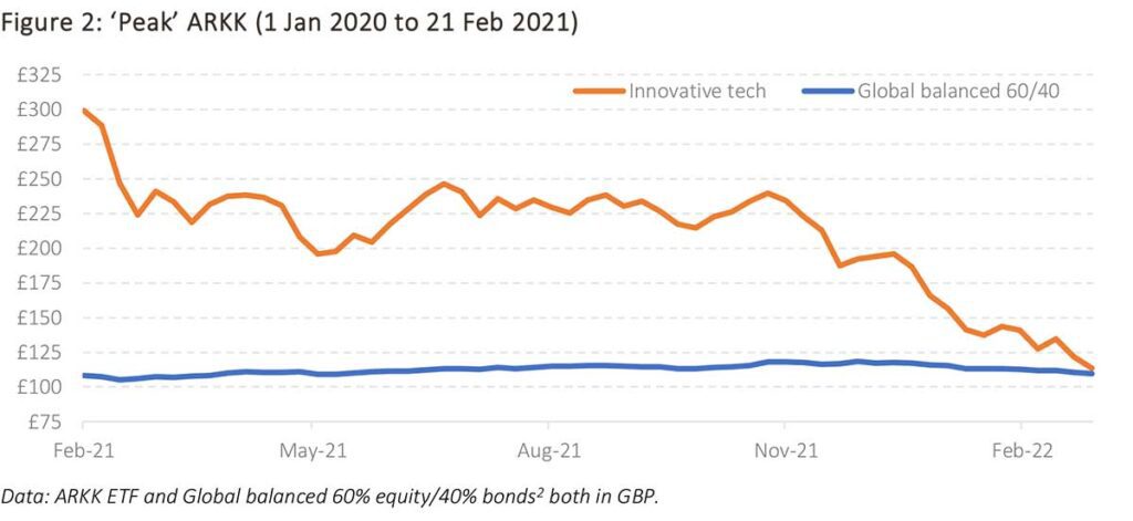 The past two years have given us quite a few live examples of this maths in action, including Cathy Woods’ innovative technology fund ARKK, which posted a stellar return of around 200% from the start of 2020 to February 2021. She quickly became the darling of the US financial TV shows. If we compare that to a more ‘boring’ portfolio comprising 60% in global equities and 40% in higher quality bonds1, which returned in the region of 8% over the same period, we may feel a bit disappointed. Yet 8% is actually a good outcome, given that in Q1 2020 the markets fell substantially on the back of the pandemic.
